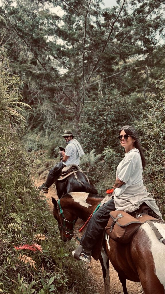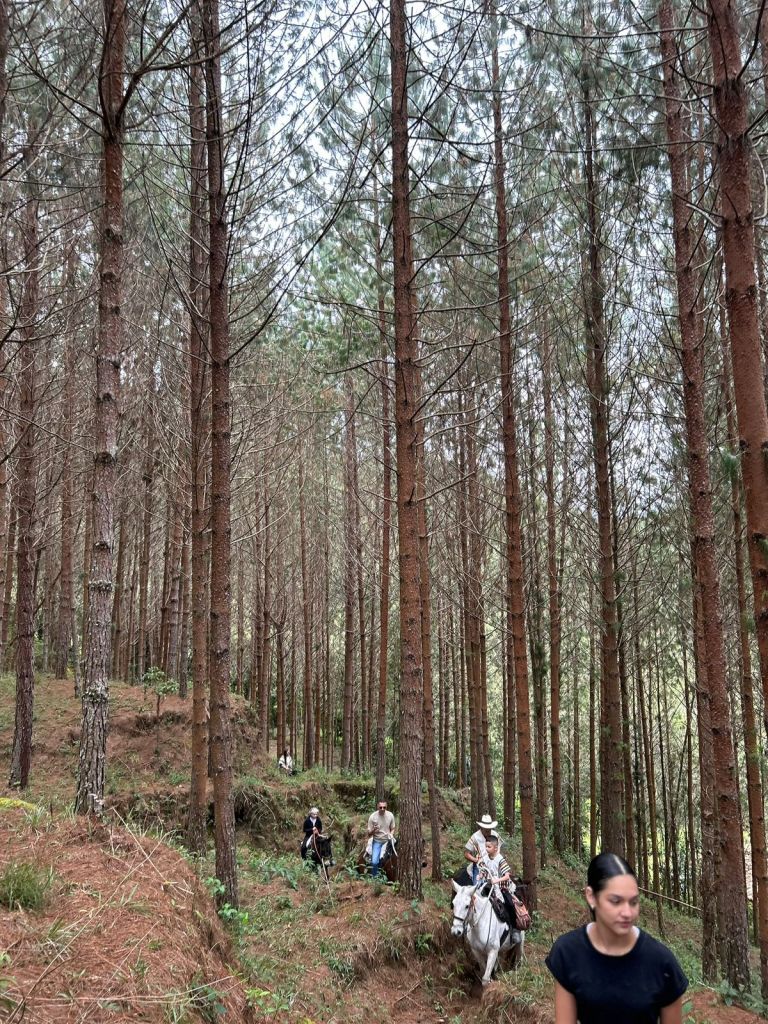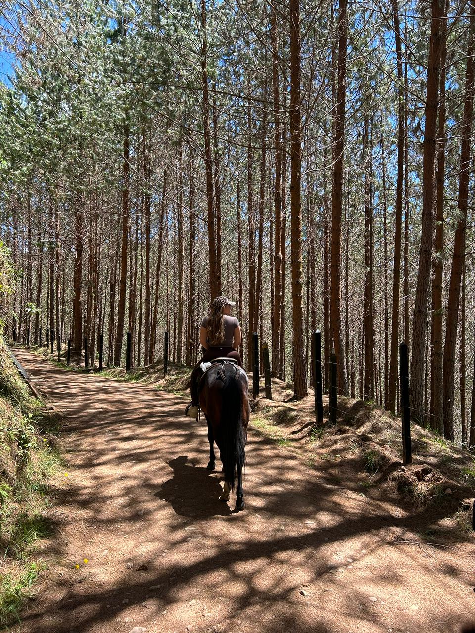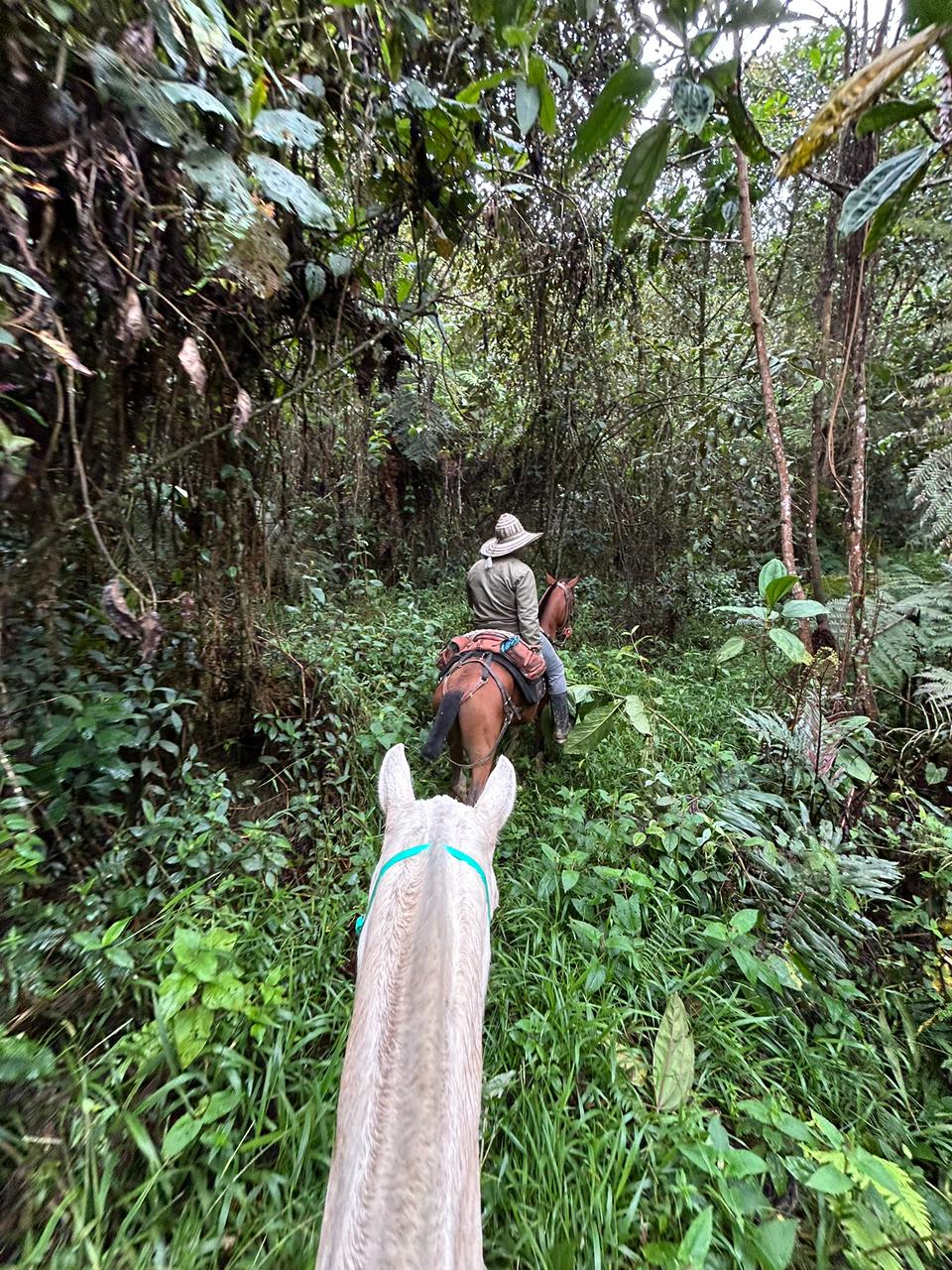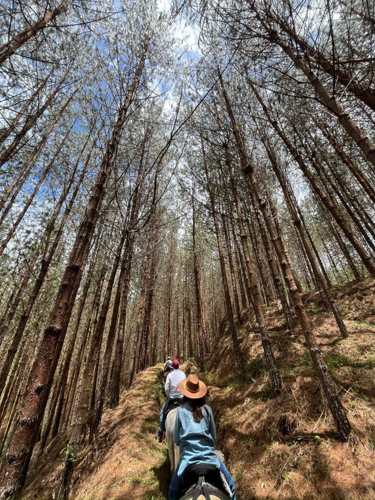 Nuestra ruta ideal para quienes desean más tiempo a caballo, sin exagerar iniciamos entre riachuelos y caminos de herradura dentro de la reserva, ascendiendo poco a poco hasta atravesar pequeñas fincas campesinas y adentrarnos en el Bosque encantado, una pinera llena de aire fresco y tranquilidad